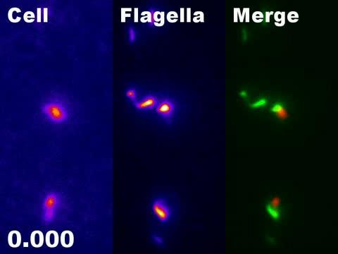 video: The cell bodies and flagella of C. jejuni are made to fluorescent, showing how they swim by wrapping their flagella around their bodies