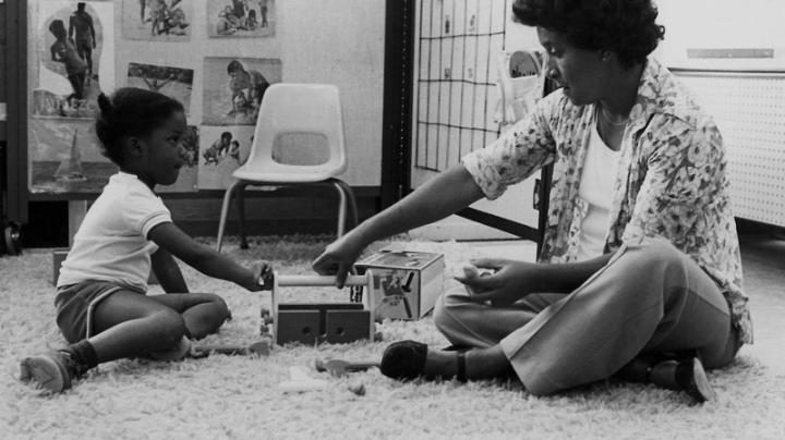 image: A teacher guides a student through a task in this historical photo of the Abecedarian Project, an early education, randomized controlled trial that began at the University of North Carolina and has followed the participants since 1971. Now, Virginia Tech researchers including Craig Ramey, Sharon Landesman Ramey, and Read Montague have revealed discoveries about the lasting effects of that early education on brain structure.