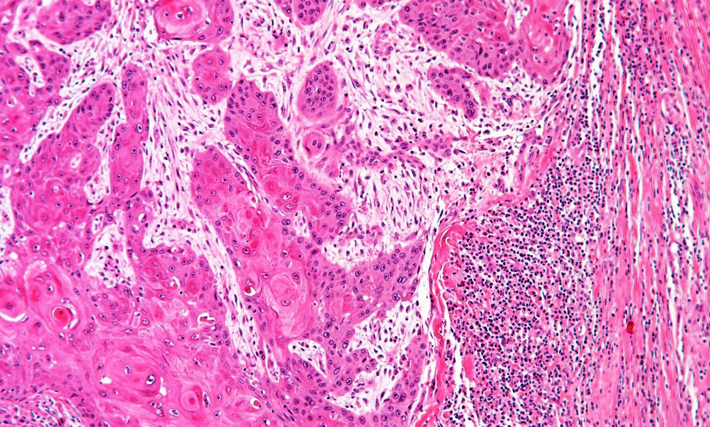 image: Human cancer under a microscope. The black dots on the right of the image are lymphocytes which are trying to get at the tumor, but are being stopped by cancer-associated fibroblasts.