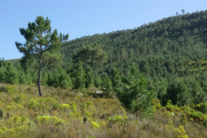 image: Pinus pinaster, one of many non-native trees that is highly invasive and causes major impacts in South Africa. The image shows a dense invasive stand of pines in the mountains of the Western Cape.