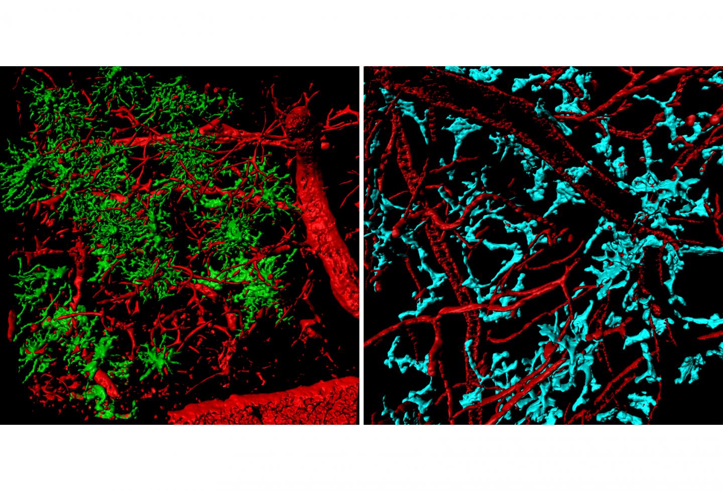 image: Brain tumor-associated microglia (left, green) and blood-derived macrophages (right, cyan) appear different when visualized by multiphoton microscopy. The microglia appear to be bushy and seaweed-like, exhibiting minimal migratory behavior, while the blood-derived macrophages are smaller and rounder, and zip around the tumor along blood vessels, shown in red.