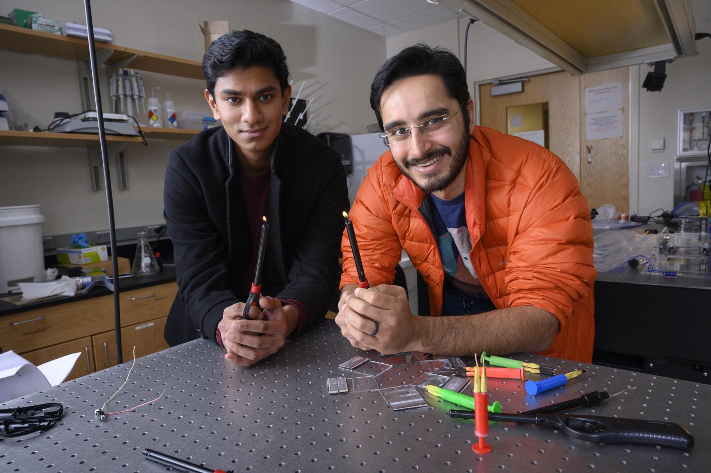 image: Georgia Tech undergraduate student Gaurav Byagathvalli and assistant professor Saad Bhamla are shown with examples of butane lighters they used to create the inexpensive ElectroPen - an electroporator device useful in life sciences research.
