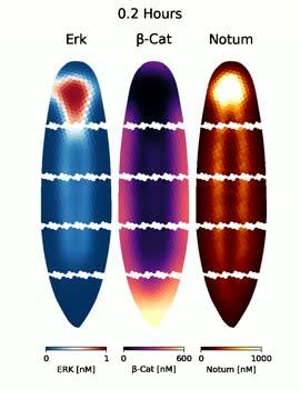 video: Calculated redistribution of morphogens Erk, beta-Cat, and Notum after flatworm fragmentation. Re-set gradients help determine head-to-tail polarity in fragment regeneration