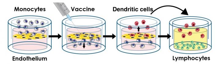 image: Step 1: A study participant's immune cells (monocytes) are applied to the tissue construct, which consists of a layer of human endothelial cells grown over a 3D network of human proteins. The monocytes migrate down into the protein matrix, mimicking the natural movement of monocytes out of capillaries and into local body tissues. Step 2: A vaccine is added to the construct, which is incubated for 48 hours. Some of the monocytes differentiate to become dendritic cells during this time. Step 3: Mature dendritic cells emerge from the construct, resembling the movement of the body's dendritic cells to the lymphatic (lymph node) system. Step 4: Dendritic cells are harvested from the construct and cultured with T cells from the same study participant to measure immune response.