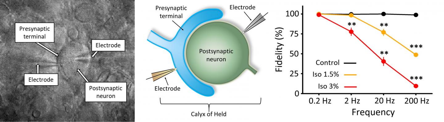 The CMSF unit used rat brain slices to study a giant synapse called the calyx of Held. The scientists induced electrical signals at different frequencies and then detected the action potentials generated in the postsynaptic neuron. They found that as they increased the frequency of electrical signals, isoflurane had a stronger effect on blocking transmission.