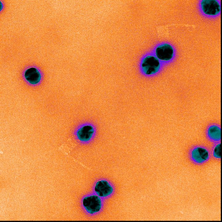image: Electron microscopy image of DNA origami rotor arms, which are the faint orange "L's" attached to the purple tracking particles.