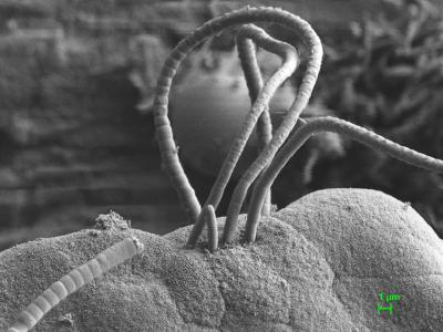 A little-known bacterial species called segmented filamentous bacterium, or SFB, can activate the production of specialized immune cells in mice. This scanning electron microscope image of an SFB colony shows a mass of long hair-like filaments created when the bacteria stay attached to each other after they divide.