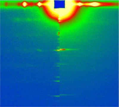 This is a composite image made from two low-angle diffraction data sets, one taken with muscle fibers at rest (left), and the other with muscle fibers under isometric contraction (right). The color corresponds to the intensity of the X-rays scattered elastically at a very small angle. From the changes, the conformation of the molecular motors is computed.