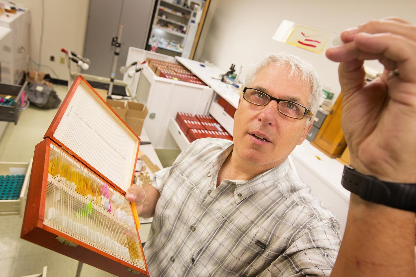 Scott Gardner examines parasite samples in the Harold W. Manter Laboratory of Parasitology at the University of Nebraska-Lincoln