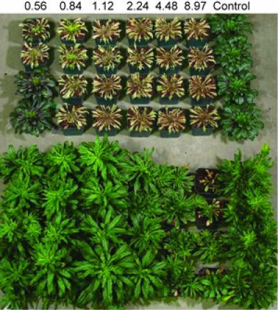 Spraying resistant horseweed under cold conditions circumvented the resistance mechanism. All of the cold-acclimated horseweed treated with herbicide at normal field-rate levels or higher succumbed to its lethal effects (top). Resistant horseweed plants maintained under warm conditions survived treatment (bottom), with the exception of plants sprayed at 10 times the usual field-use rate (dead plants to right in bottom block).