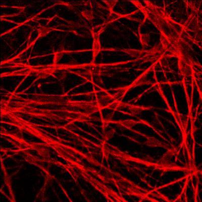 These neurons (stained red) were generated from the skin cells of an adult patients with frontotemporal dementia.
