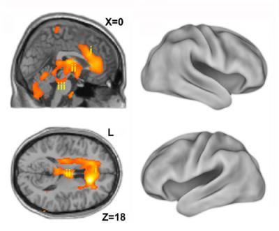 This image shows one returning from oblivion -- imaging the neural core of consciousness. Positron emission tomography (PET) findings show that the emergence of consciousness after anesthesia is associated with activation of deep, phylogenetically old brain structures rather than the neocortex. Left: Sagittal (top) and axial (bottom) sections show activation in the anterior cingulate cortex (i), thalamus (ii) and the brainstem (iii) locus coeruleus/parabrachial area overlaid on magnetic resonance image (MRI) slices. Right: Cortical renderings show no evident activations.