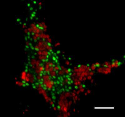The enrichment of the microorganisms responsible for marine AOM, archaea in red and bacteria in green from the Isis Mud Volcano in the Mediterranean Sea has taken eight years of continuous incubation. Without these cultures it would not have been possible to trace down the complex sulfur cycling involved in AOM.
