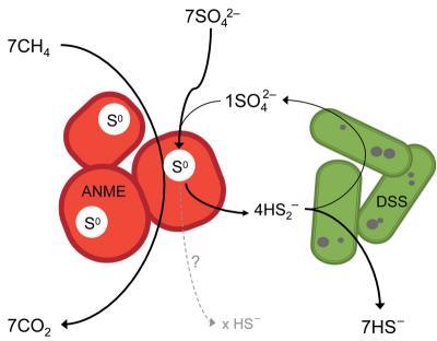 In this model, methane oxidation and sulfate respiration to elemental sulfur (or all the way to sulfide) is performed by the methanotrophic archaea. The associated bacteria are disproportionators (sulfur fermentors), which take up produced elemental sulfur in the form of disulfide and turn it into sulfate and sulfide. Dark circles represent iron- and phosphorus-rich precipitates found in the bacteria.