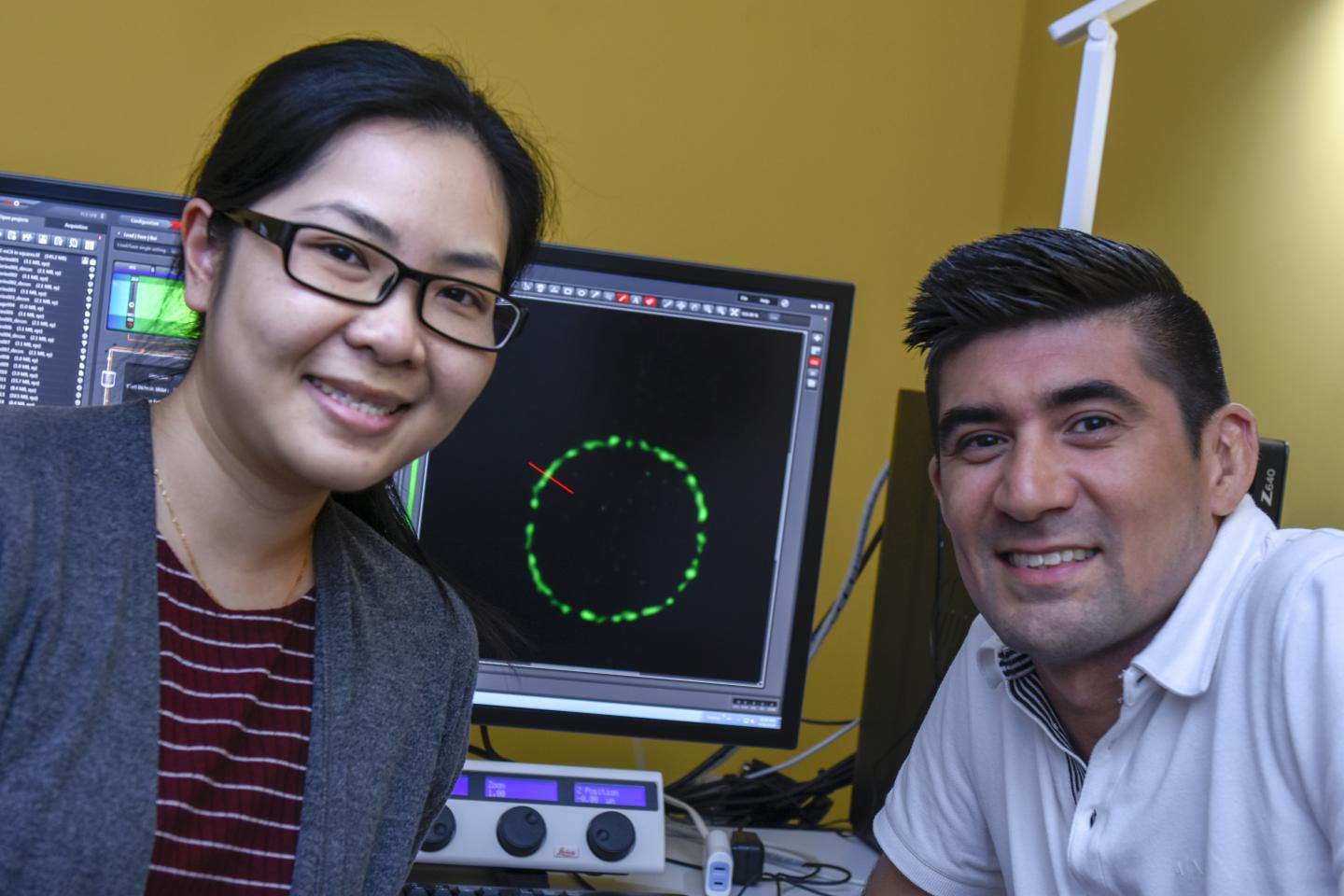 image: Researchers Dr. Bill Söderström (right) and co-author Dr. Helena Chan (left) in their microscopy lab, analyzing a bacterial Z-ring.