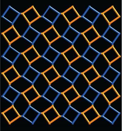 This 2-D image illustrates a lattice composed of two repeating squares that represent molecular structures, one rotated clockwise (color coded blue) and another counterclockwise (color coded orange) with respect to each other. Such structures have many more symmetries than had been recognized before a new way of understanding the structure of proteins, polymers, minerals, and engineered materials was discovered by Venkatraman Gopalan and Daniel B. Litvin at Penn State Unviersity (to be published in May 2011 in Nature Materials). The discovery, a new type of symmetry in the structure of materials, greatly expands the possibilities for discovering or designing materials with desired properties. The research is expected to have broad relevance in many development efforts involving physical, chemical, biological, or engineering disciplines including; for example, the search for advanced ferroelectric ferromagnet materials for next-generation ultrasound devices and computers.