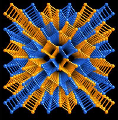 This 3-D image illustrates a lattice composed of columns of squares that represent repeating molecular structures, one rotated clockwise (colored blue) and another counterclockwise (colored orange) with respect to each other. Such structures have many more symmetries than had been recognized before a new way of understanding the structure of proteins, polymers, minerals, and engineered materials was discovered by Venkatraman Gopalan and Daniel B. Litvin at Penn State Unviersity (to be published in May 2011 in Nature Materials). The discovery, a new type of symmetry in the structure of materials, greatly expands the possibilities for discovering or designing materials with desired properties. The research is expected to have broad relevance in many development efforts involving physical, chemical, biological, or engineering disciplines including; for example, the search for advanced ferroelectric ferromagnet materials for next-generation ultrasound devices and computers.