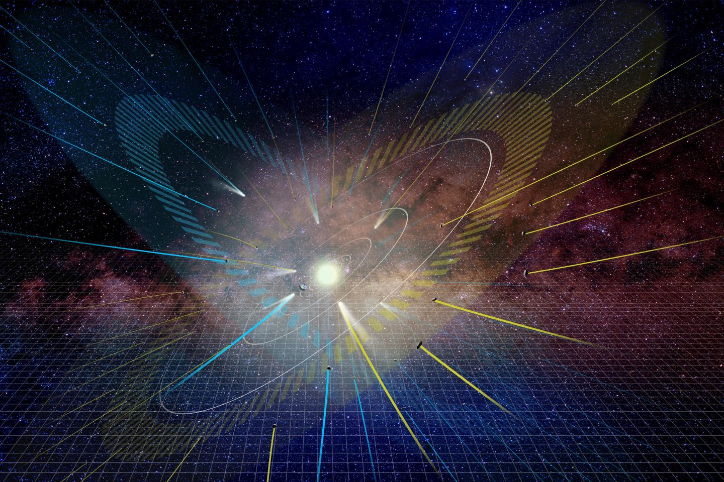 image: The converging lines represent the paths of the comets. The ecliptic plane is shown in yellow and the empty ecliptic is shown in blue. The background grid represents the plane of the Galactic disk.