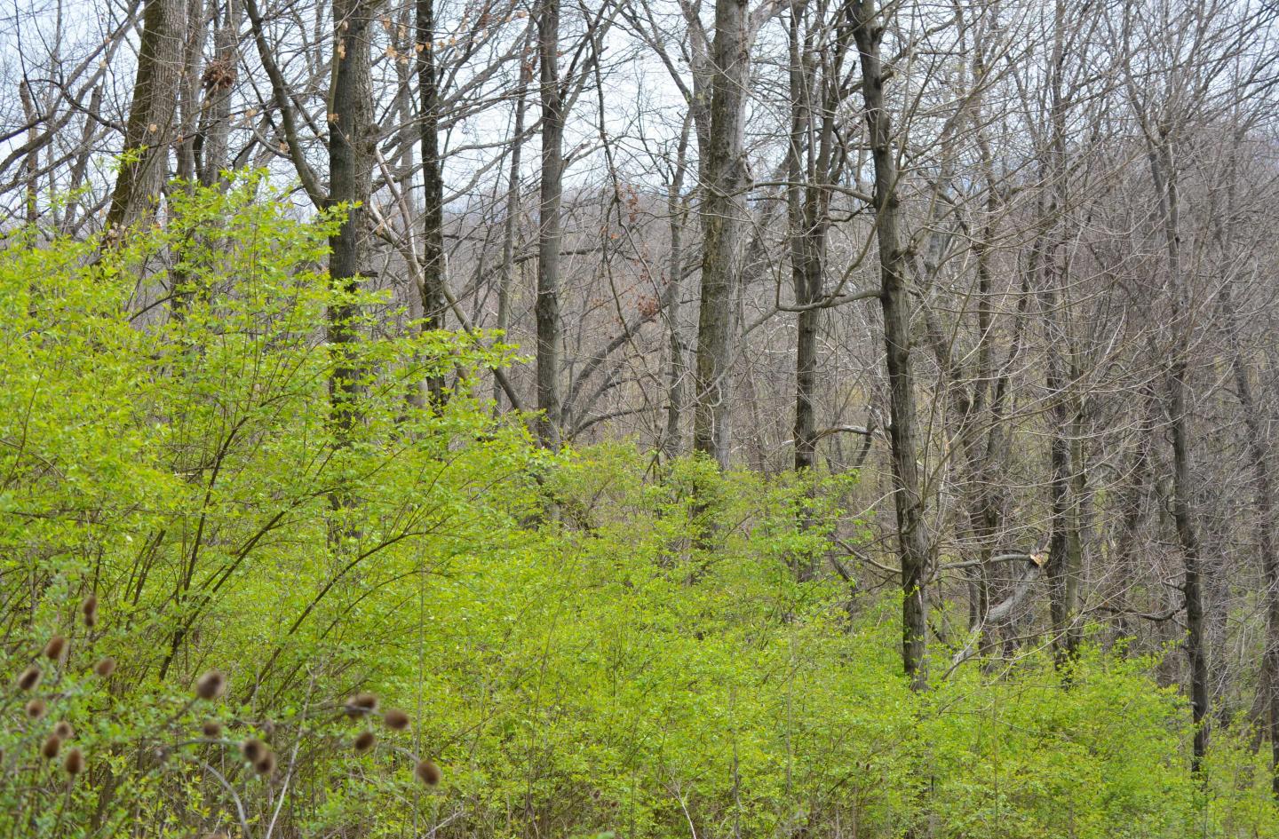 image: Amur honeysuckle, like this patch seen in Ohio in November, stays greener longer into fall than most native trees and bushes.