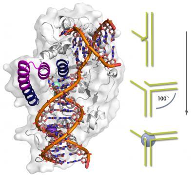 "We saw that FEN1 binds the double-strand DNA on either side of the 5' flap and opens it by severely bending the template strand all the way back to 100 degrees, almost at right angles," says Tsutakawa. "Only because there's a break on one side of the double-stranded DNA at that point can the DNA bend that sharply."