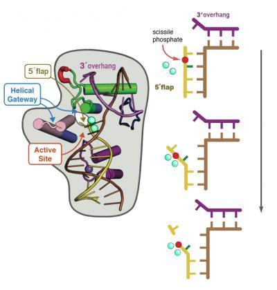 Tsutakawa summarizes the findings: "FEN1 grasps the template of the double-strand DNA where the junction is bent 100 degrees. The helicity of the double strand positions the 5' flap, threading it through the arch. The helicity of the double strand, plus the binding of the 3' overhang, also prompts the disordered parts of FEN1 to close up. Finally two paired bases on the 5' flap are pulled apart over the metal ions, triggering incision at the scissile phosphate."