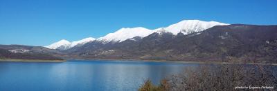 image: Campotosto Lake looking north, with the top of Mount Gorzano in the center of the picture and the Sibillini Mountains in the background. Campotosto village is on the left side.