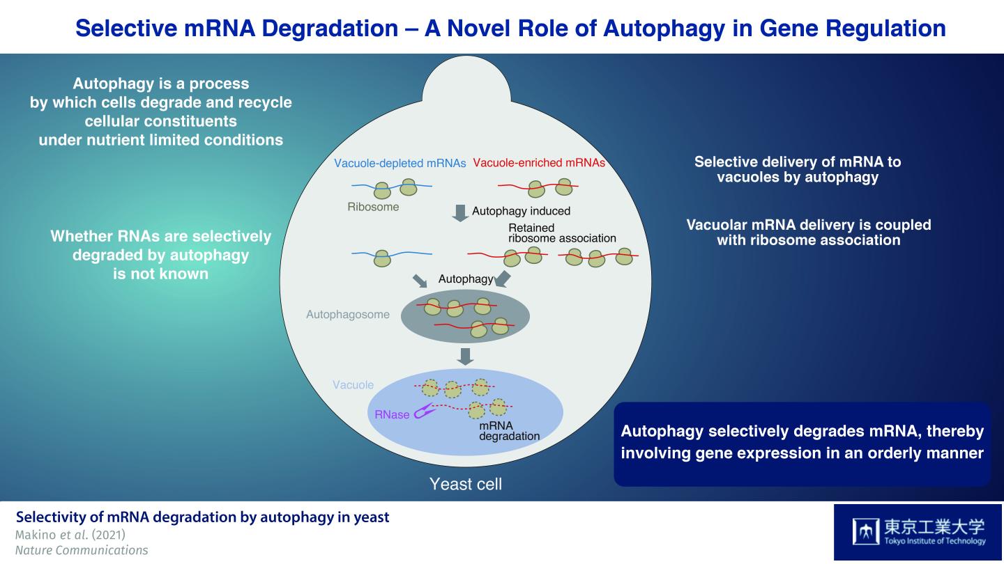 In their latest study, which was published in Nature Communications, researchers from the Tokyo Tech and RIKEN conducted a detailed analysis of the preferential degradation by autophagy of messenger RNAs (mRNAs), which contain the information required to make cellular protein and bind ribosomes for protein synthesis. Corresponding author Prof. Yoshinori Ohsumi of the Tokyo Tech, who was awarded the 2016 Nobel Prize in Physiology or Medicine for his pioneering work in the field of autophagy, explained the group's findings, stating "We have previously shown that RNA delivered to the vacuole via autophagy in yeast cells, where it is degraded by vacuolar nucleases. The question of whether RNA degradation by autophagy occurs preferentially, however, remains unaddressed. This difficult to address question was the starting point of this project."