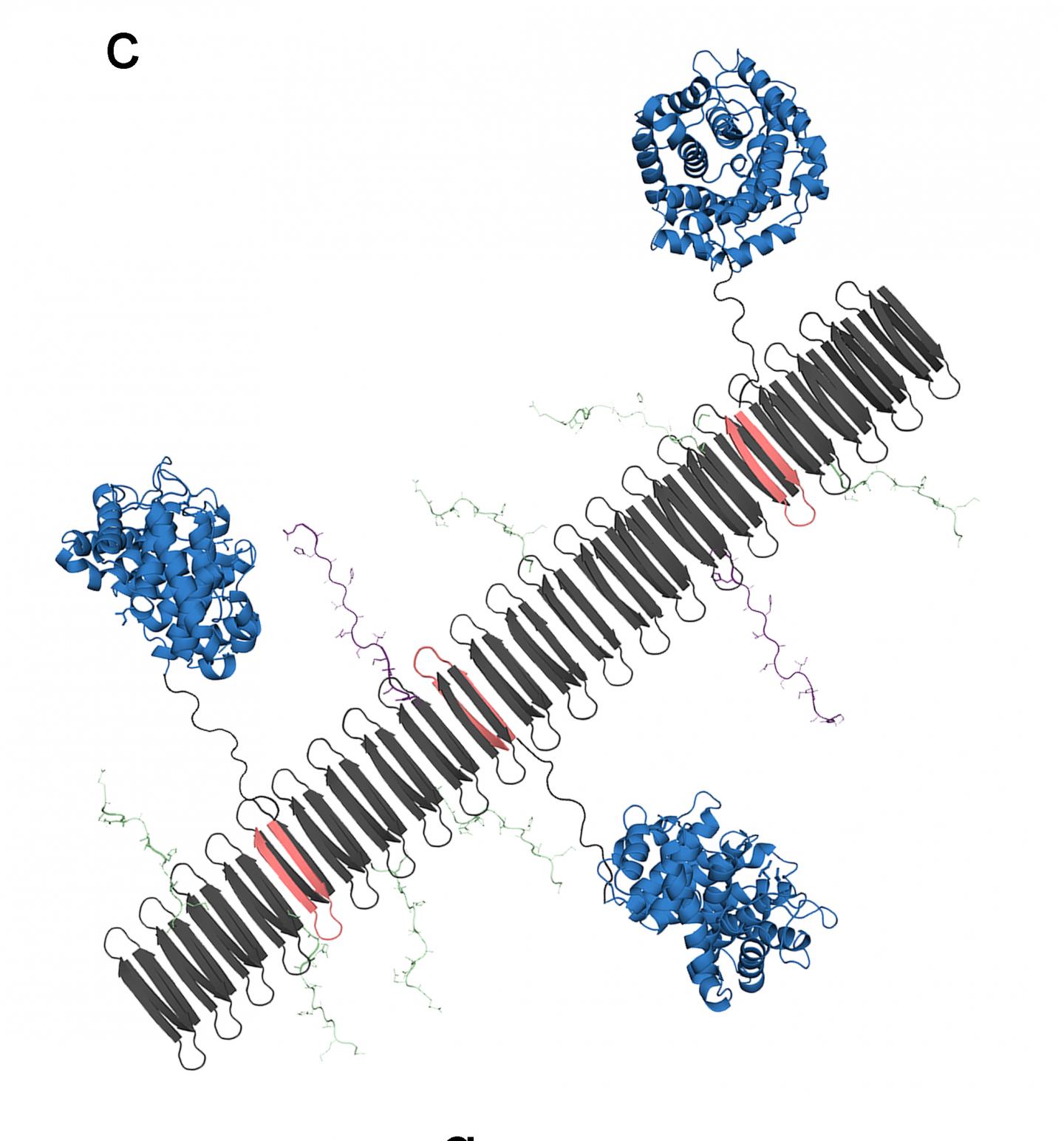 image: A graphic of a supramolecular peptide nanofiber bearing complement protein C3dg (blue), B-cell epitopes (green), and T-cell epitopes (purple).