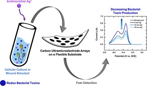 For the new study, the researchers built an early prototype of an electroanalytical wound sensor based on carbon ultra- microelectrode arrays (CUAs) on flexible substrates. In previous studies, this sensor had been placed on quartz substrates, but to ensure flexibility, the authors developed a method of putting the arrays on a polyethylene terephthalate (PET) substrate.