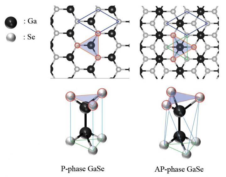 To compare the structural stability of the P and AP phases of GaSe, the researchers first calculated the total energy at different in-plane lattice constants, which represent the size of a unit cell in the crystal, given that its structure comprises a "lattice" or organized meshwork of atoms. The lowest energy that corresponds to the most stable state was computed and at this state, the P phase was found to be more stable than the AP phase.