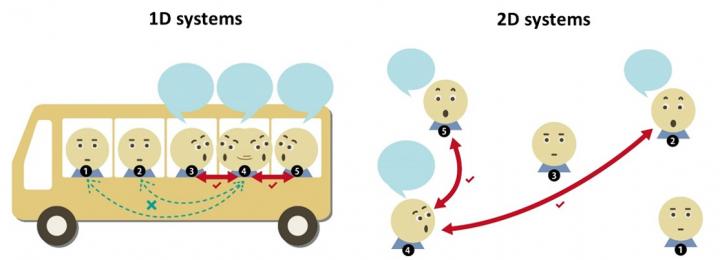 image: For exciton-exciton annihilation to occur, two excitons must interact with each other. These interactions are well-characterized for 1D and 2D systems. In a 1D system, we can think of exciton interactions occurring like schoolchildren talking on a bus. For example, exciton 4 can interact with its neighbors, exciton 3 or 5, but cannot interact with exciton 1 and 2 due to space constraint. In a 2D system, like schoolchildren in a playground, exciton 4 can now freely move in both dimensions, and can interact with any other exciton - for example, exciton 2 or 5. The scientists aim to find out how the interactions occur in phosphorene, a quasi-1D system.