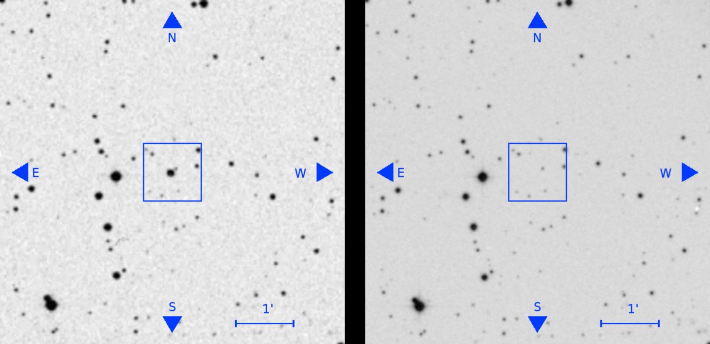 image: A source visible in an old plate (left, seen as the bright source at the centre of the square) has disappeared in a later plate (right). From Villarroel et al. (2019).