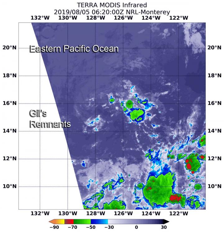 On Aug. 5 at 2:20 a.m. EDT (0620 UTC), the Moderate Imaging Spectroradiometer or MODIS instrument that flies aboard NASA's Terra satellite gathered infrared data on Gil's remnants. There were a couple of small areas of strong storms where thunderstorms had cloud top temperatures as cold as minus 50 degrees Fahrenheit (minus 45.5 Celsius), but Gil is not expected to regenerate.