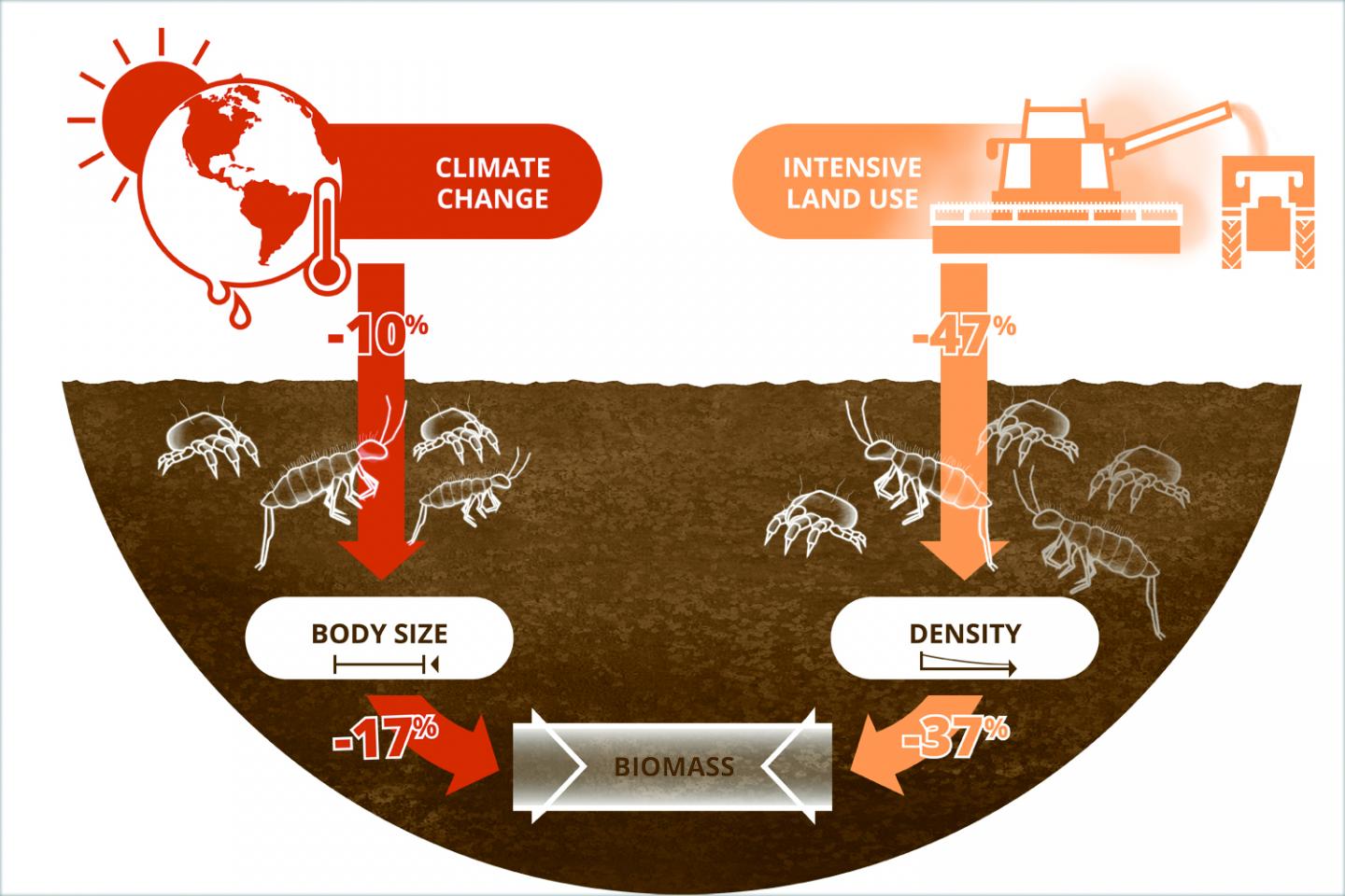 image: Climate change and land use reduce the biomass of soil animals. While changing climate reduces the body size of organisms, cultivation reduces their frequency.