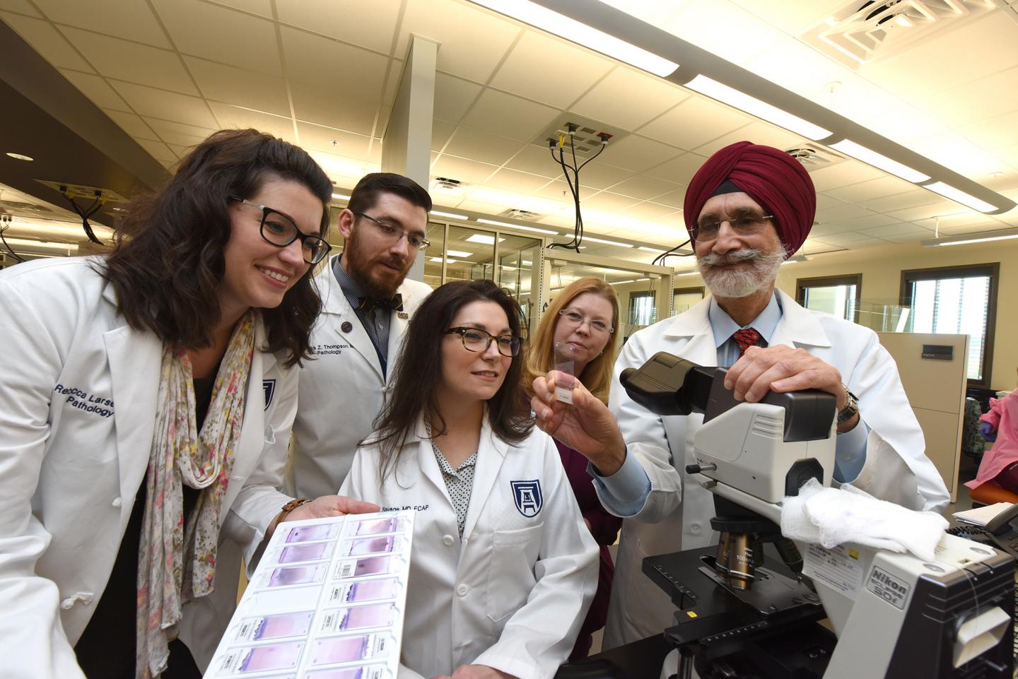image: Investigators in the Medical College of Georgia at Augusta University Department of Pathology laboratory from left, pathology resident Dr. Rebecca Kunak, Dr. Thomas Thompson, Associate Professor Dr. Natasha Savage, Ms. Jennie Chazelle, and Dr. Gurmukh Singh.