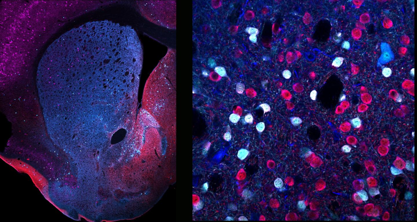 image: Neuronal diversity in the striatum: Coronal view of a mouse striatum (including the dorsal striatum and the nucleus accumbens) where different neuronal types are stained (left) and high magnification image showing the high diversity of neuronal populations within the striatum (right).