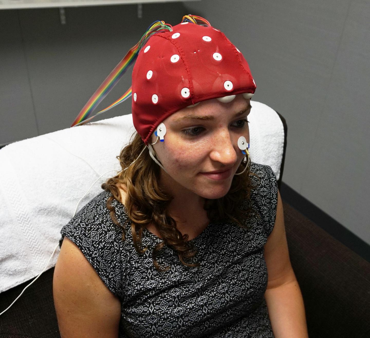 image: TraciAnn Hoglind, a researcher in the SDSU Laboratory for Language and Cognitive Neuroscience, demonstrates the EEG cap worn by study participants while they identified pictures by signing.