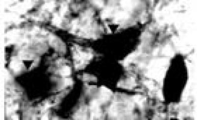 Tyrosine hydroxylase-positive noradrenergic neurons (arrow) in the locus coeruleus of aged mice carrying mutant amyloid-β precursor protein and presenilin-1 genes were decreased.
