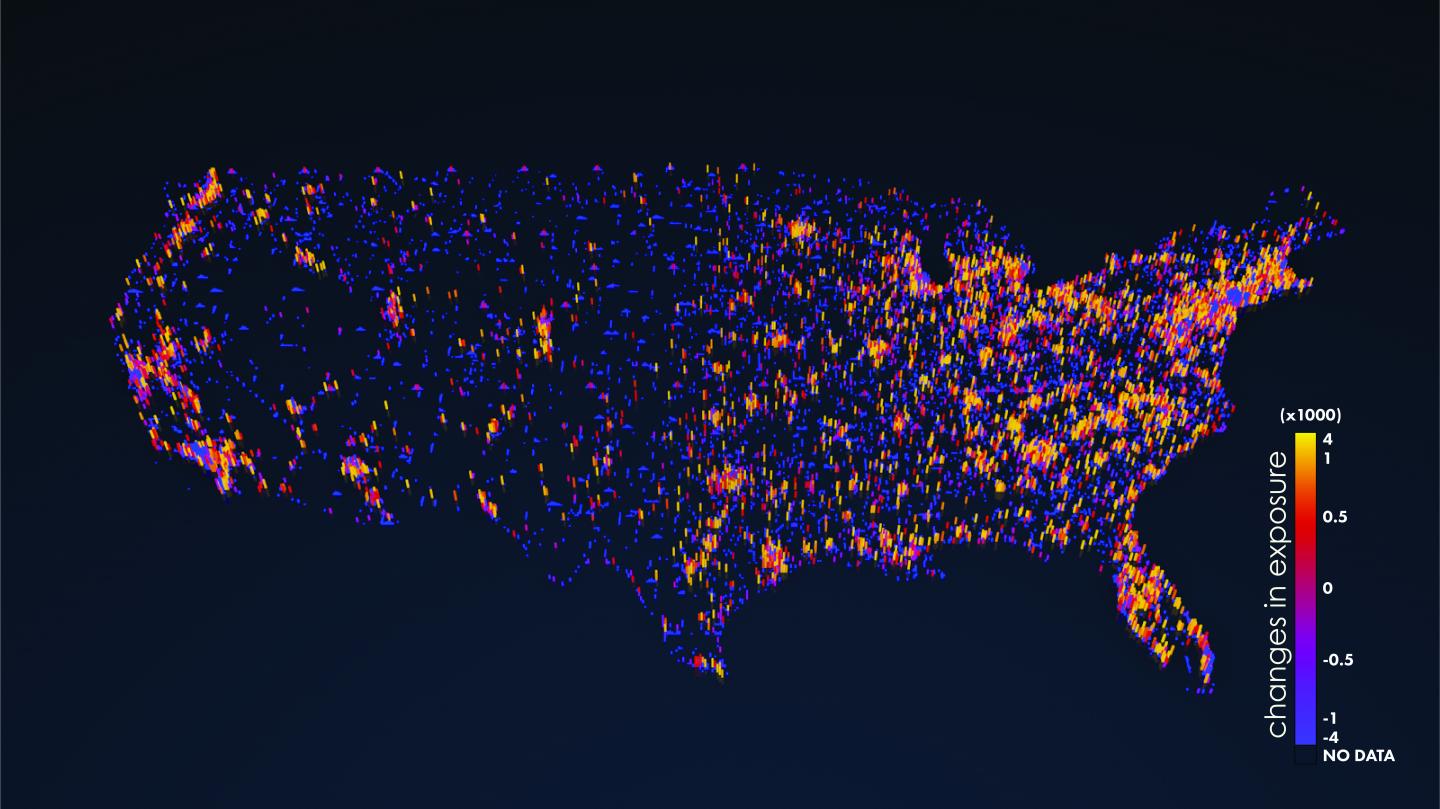 image: The map displays projected changes in human exposure to extreme climate events at a 1-kilometer scale from 2010 to 2050, which range from minor decreases in rural and suburban areas to moderate and major increases in densely populated urban centers.
