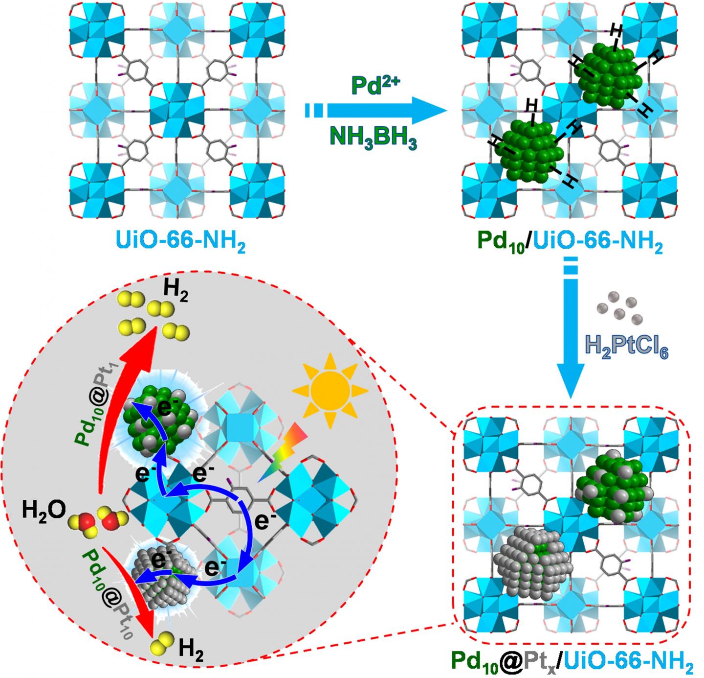 The bimetallic core-shell-structured Pd@Pt NPs have been in situ fabricated and stabilized by a photosensitive and representative metal-organic framework (MOF), UiO-66-NH2. The microstructure of the Pd10@Ptx co-catalyst can be precisely controlled from core-shell to single-atom alloy (SAA), during which Pt coordination environment changes, by precisely and simply tuning the Pt content.
