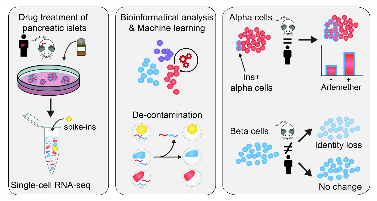 Having now obtained a "decontaminated" transcriptome, from which the spurious signal has been removed, they proceeded to characterize how the cellular identity in the different cell types responded to the treatment with three different drugs. They found that a small molecule inhibitor of the transcription factor FOXO1 induces dedifferentiation of both alpha and beta cells. Furthermore, they studied artemether, which had been found to diminish the function of alpha cells and could induce insulin production in both in vivo and in vitro studies (Cell. 2017 Jan 12;168(1-2):86-100.e15. DOI: 10.1016/j.cell.2016.11.010). The effects of the drug artemether were species-specific and cell-type-specific. In alpha cells, a fraction of cells increases insulin expression and gain aspects of beta cell identity, both in mouse and human samples. Importantly, researchers found that in human beta cells, there is no significant change in insulin expression, whereas in mouse islets, beta cells reduce their insulin expression and overall beta cell identity.
