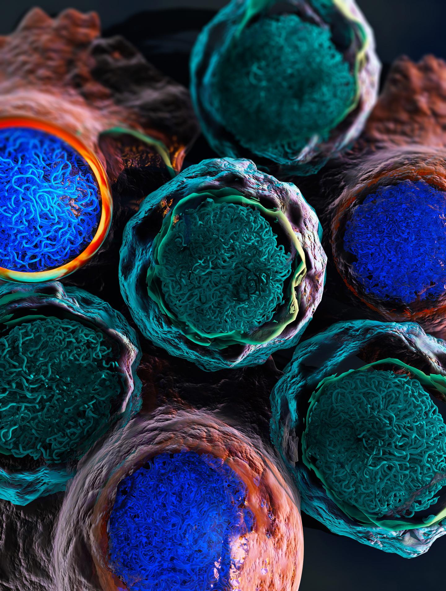 image: Leukemia cells are depicted in green, normal blood cells in red, and the intricate bundles in each cell visualize the complex arrangement of DNA and chromatin in the cell nucleus.