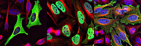 image: HeLa cells expressing PHLPP (left), the segment with the nuclear localization signal (middle), and that same segment mutated (right).