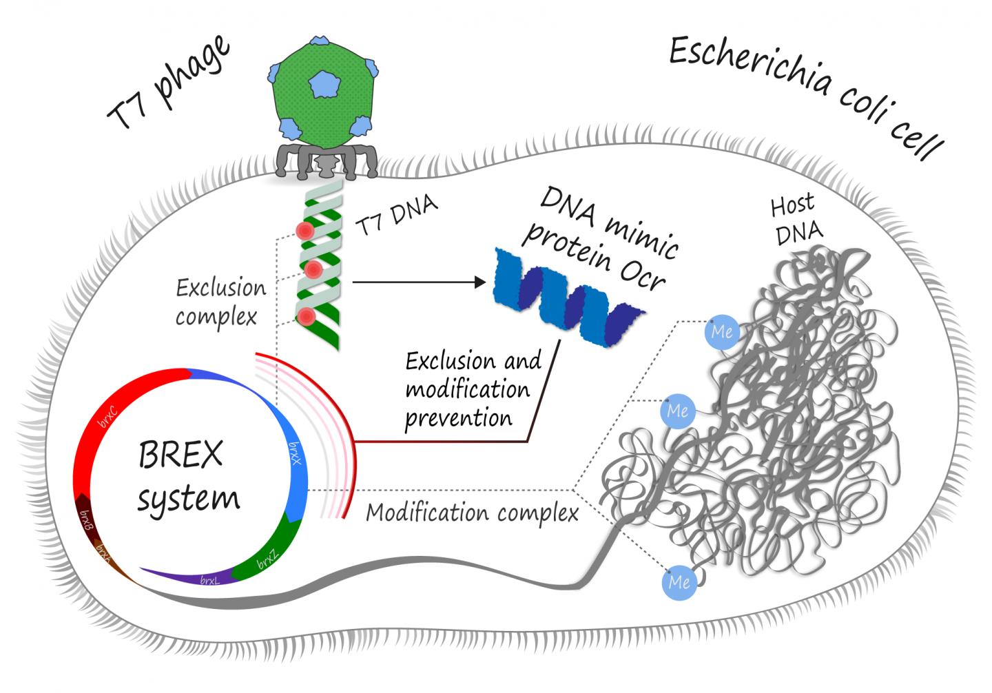 It is yet unknown whether BREX simply destroys the incoming phage DNA or somehow inhibits its replication, but almost all BREX mechanisms employ a BrxX methyltransferase, an enzyme in charge of "marking" bacterial DNA for self-recognition. The Ocr protein apparently binds to this methyltransferase and thus prevents the BREX system from both methylation of the host DNA and attacking the non-methylated phage genome.