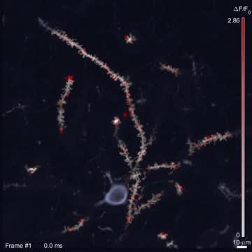 video: SLAP microscopy allows scientists to watch the activity of hundreds of synapses at a time in the brains of living animals. Here, red bursts mark synapses of a mouse neuron being excited by the neurotransmitter glutamate.