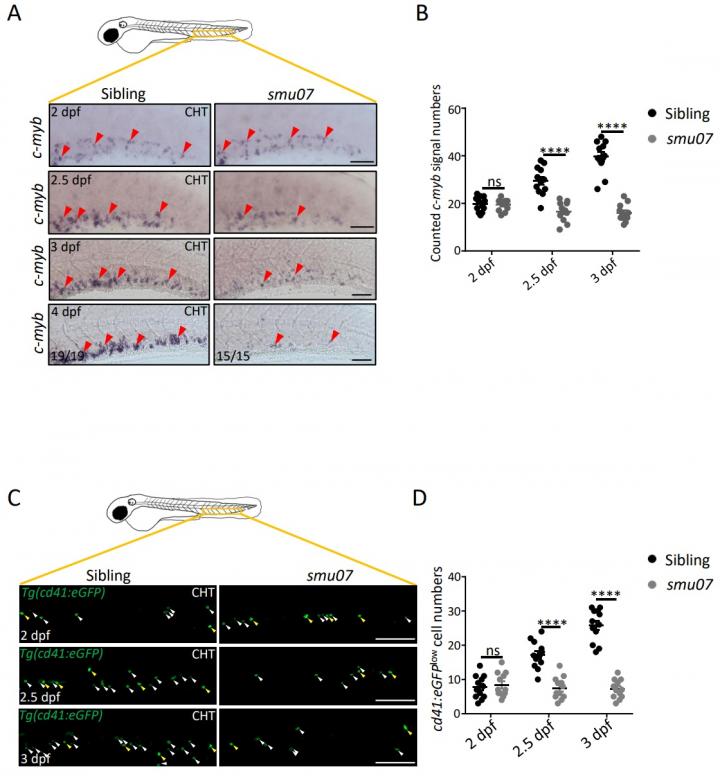 In this research, the researchers first conducted a more in-depth phenotypic identification of the smu07 mutant, obtained by the previous ENU mutagenesis. The hematopoietic defects of the erythroid, myeloid, and lymphoid lineages of the mutant were all present, suggesting that the upstream HSPCs may have been defected. Further investigation showed that the mutant's HSPCs could be produced normally at the initial stages, but then failed to expand continuously, and the number of HSPCs was significantly lower than that of normal zebrafish (Figure 1).