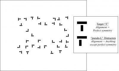 Participants performed an artificial search test on a computer screen n which they had to identify one particular T-shaped arrangement of two rectangles in a field of eight to 32 similar shapes. Half of the screens they looked at didn't include the correct shape.