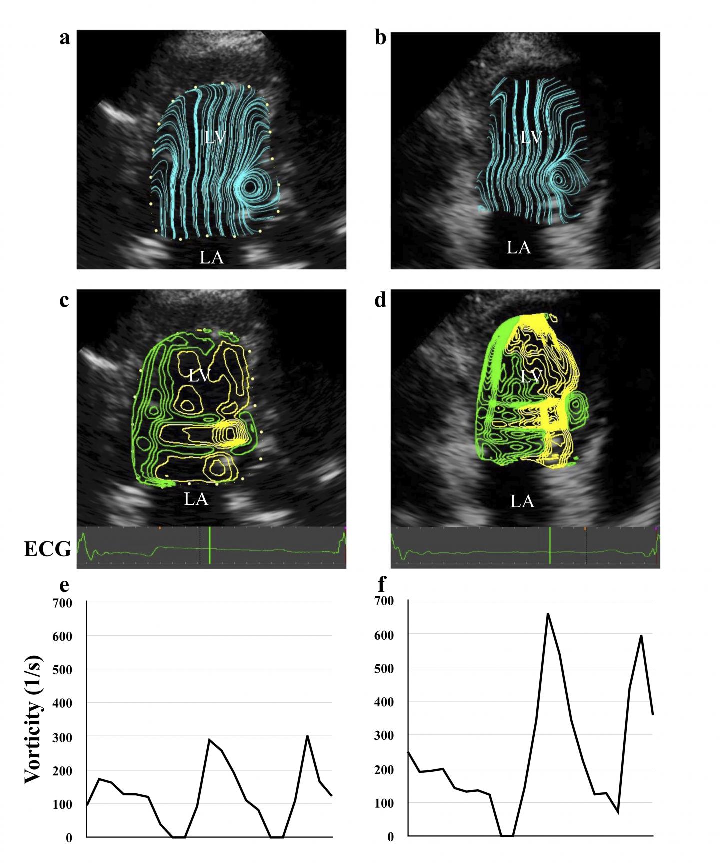 The heart expands using energy and acquires blood by creating a negative pressure in the heart. Blood entering the heart in response to the pressure difference creates a vortex in the left chamber. Currently, a method called Vector flow mapping (VFM) using echocardiography allows us to visualize and quantify the vortex flow in the heart. Their previous study found that the vortex flow in the left lower chamber (called the left ventricle) was stronger if the pressure was more different. Hence, both the vortex flow and the pressure difference in the left lower chamber when the heart expands could be markers for the diastolic function. It is noted that if the diastolic function becomes weaker, blood congestion tends to lead symptoms of heart failure such as shortness of breath.