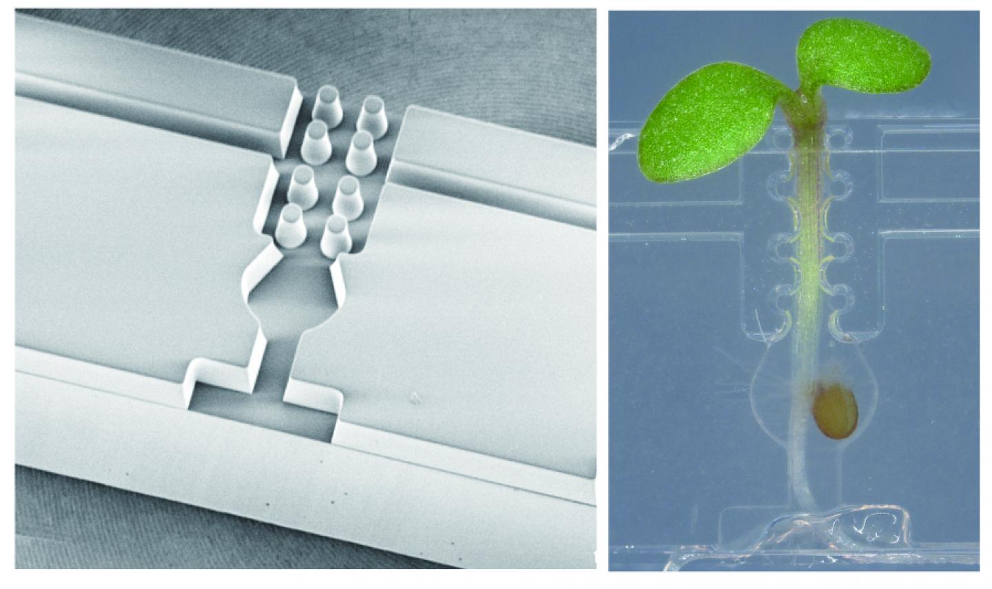The device, made from a silicon elastomer called polydimethylsiloxane, is 3.6mm wide by 17mm long and contains four identical units. Each unit is formed of a small pocket in which the plant seed is placed, a lower pathway for root growth, and an upper pathway that guides shoot growth. A horizontal slot passes through the top parts of the four units. It is used to insert a tiny blade that cuts off the scions of the developing plants. Scions from other plants are then placed into the upper pathways for grafting onto the rootstocks.