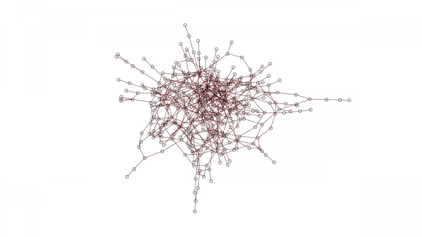 image: Image showing the nodes and lines of a prototypical power grid. It has a total of 400 nodes, of which 340 are nodes with only consumption, while the remaining 60 have consumption and generation. The nodes are interconnected by 617 lines.